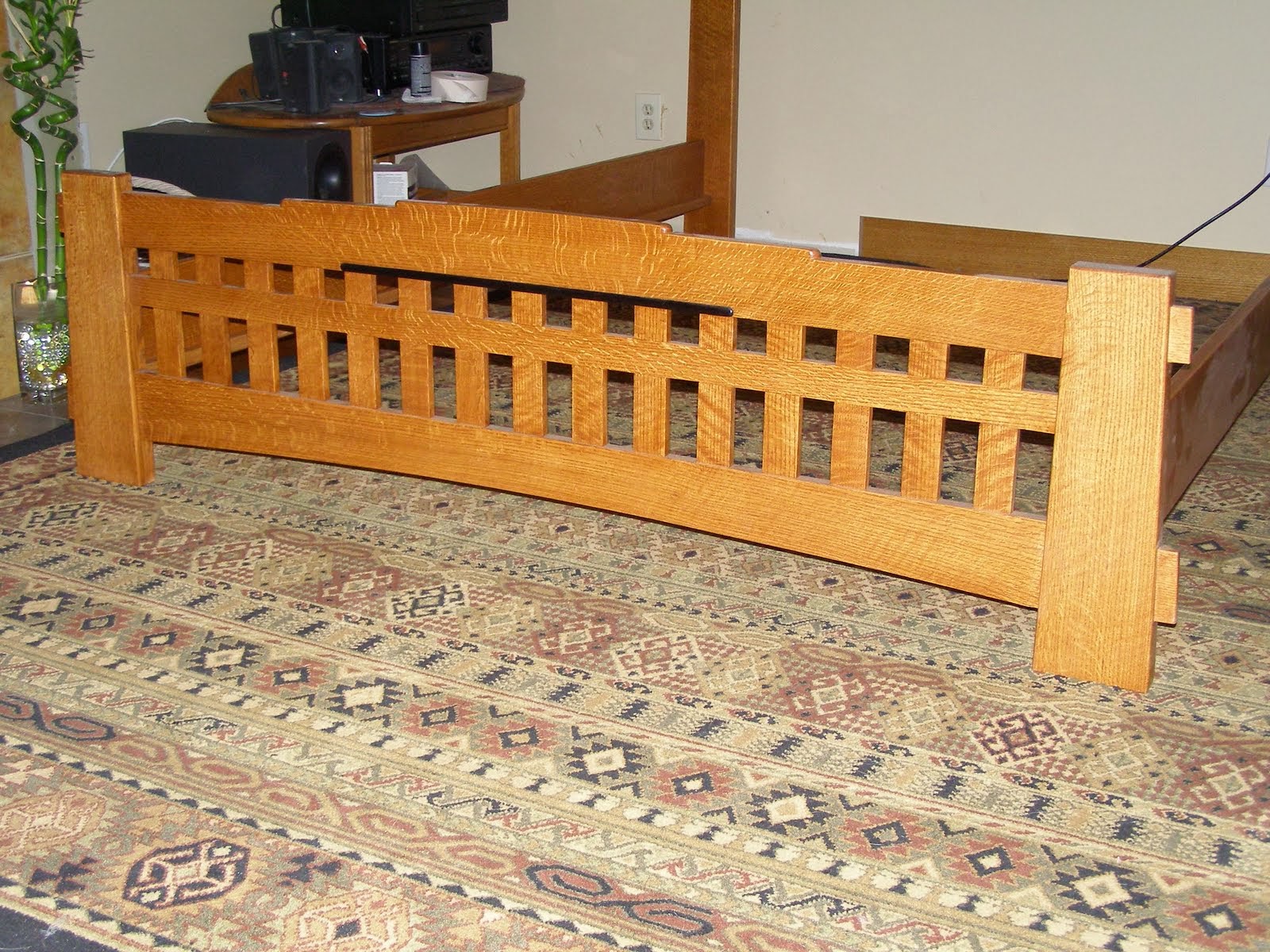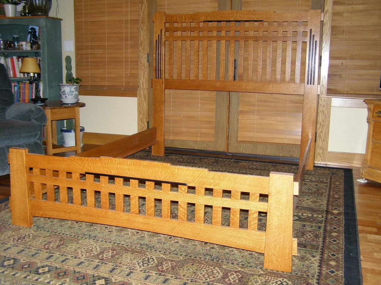 A customer liked the idea of lattice work and the Arts and Crafts style. I added the through tenons, cloud lifts and inlaid Ebony to give it a distinctly Asian look. The bed is made from solid quarter-sawn Red Oak with an oil finish. I was able to use material that had grain patterns which helped accentuate the style . The bottom foot rail has a slightly curved grain which follows the arch. The rays on the top rail of both the footboard and headboard are vertical in the center of the pieces then fan out in a sunburst effect which is quite attractive. This is a queen size bed and runs for $3,200.00 plus tax, shipping and handling.